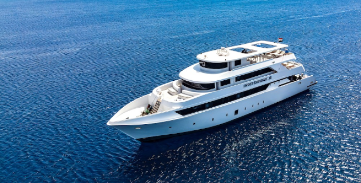 Wir sind mit der M/Y Independence III auf klassischer Brothers – Daedalus – Elphinstone Tour unterwegs. Ein Superschiff unter deutscher Leitung, welches im Jahr 2022 den Betrieb aufnahm und seither mit einem neuen Konzept im Roten Meer aufkreuzt. Alle Kabinen sind auf dem Haupt- oder Oberdeck untergebracht, haben große Panoramafenster und somit einen herrlichen Blick auf den Ozean. Für ausreichende Belüftung sorgt ein darin eingelassenes Schiebefenster und auf dem Oberdeck kann zusätzlich die Türe aufgelassen werden. Küche und Restaurant sind im Unterdeck und selbst hier erlauben große Fenster für einen Fernseh-Blick nach draußen. Der gemütliche Salon auf dem Oberdeck ist Versammlungsort für Briefings, Materialausgabe, Büro usw. Alles ist hell und freundlich gestaltet und man fühlt sich sofort überall wohl an Bord. Zwei Tauchguides organisieren die Fahrten zum Tauchplatz, begleiten jeweils eine Gruppe unter Wasser, bringen die Gruppe an die Oberfläche und zum Zodiak zurück. Um die Sicherheit vor allem an Strömungsplätzen zu erhöhen, bekommt jeder der möchte, einen ENOS – Sender an das BCD.