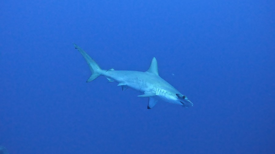 Einen Tag später am großartigen Daedalus. Obwohl auch hier den ganzen Tag Tauchergruppen an die Nordseite gefahren werden, zeigen sich die Hammerhaie mit einer Zuverlässigkeit, wie es an keinem anderen Platz in Ägypten möglich ist. Bei einem Tauchgang kreisen 15 Tiere unter uns und schicken ihren Späher nach oben, um nach dem Rechten zu schauen. Wenn sich alle Taucher ruhig verhalten, kommen auch andere der Gruppe näher an die Taucher heran. Nach solchen Begegnungen sind Unterwasser-Freudensprünge, soweit es das Wasser zulässt, unvermeidlich und jeder erzählt nach Rückkehr an der Oberfläche begeistert von seiner eigenen Begegnung der dritten Haiart.