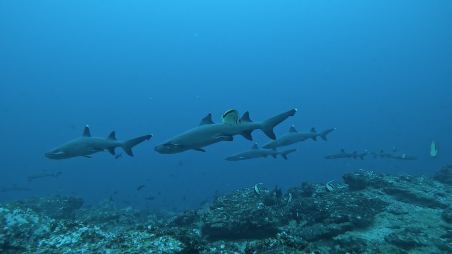 Fast alle Tauchgänge finden an Putzerstationen statt und Begegnungen mit Haien sind an der Tagesordnung. Tiger-, Galapagos-, Bullen-, Blacktip-, Silvertip-, Seiden-, Ammen- und Hammerhaie. Nur der